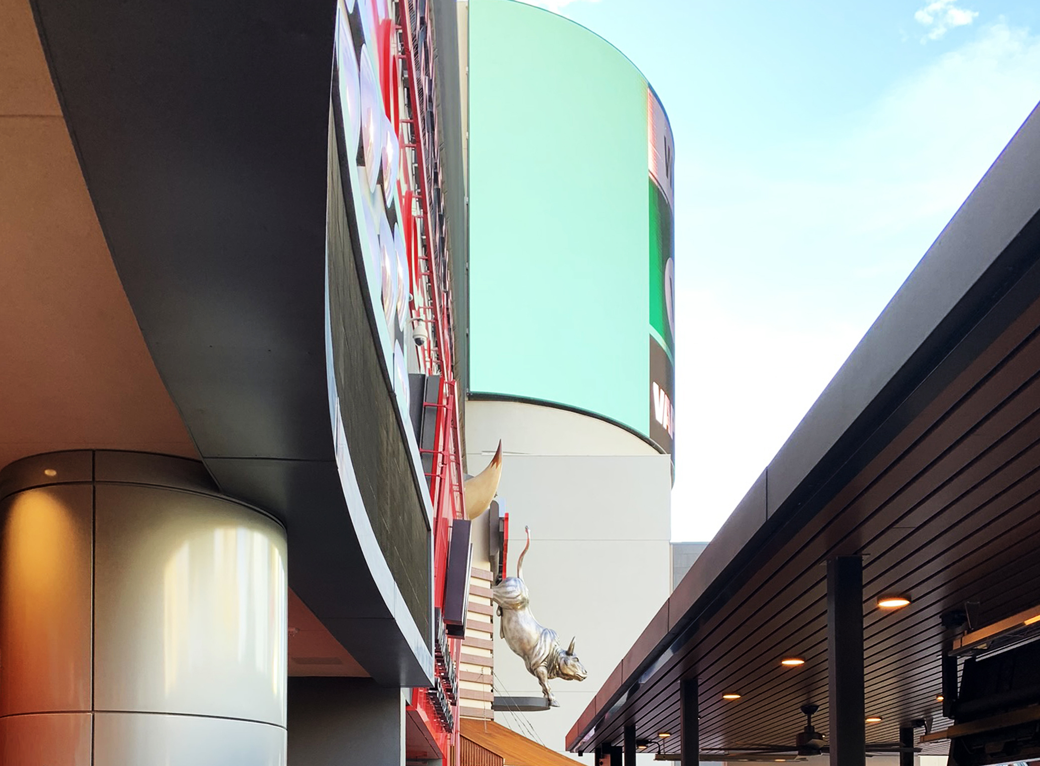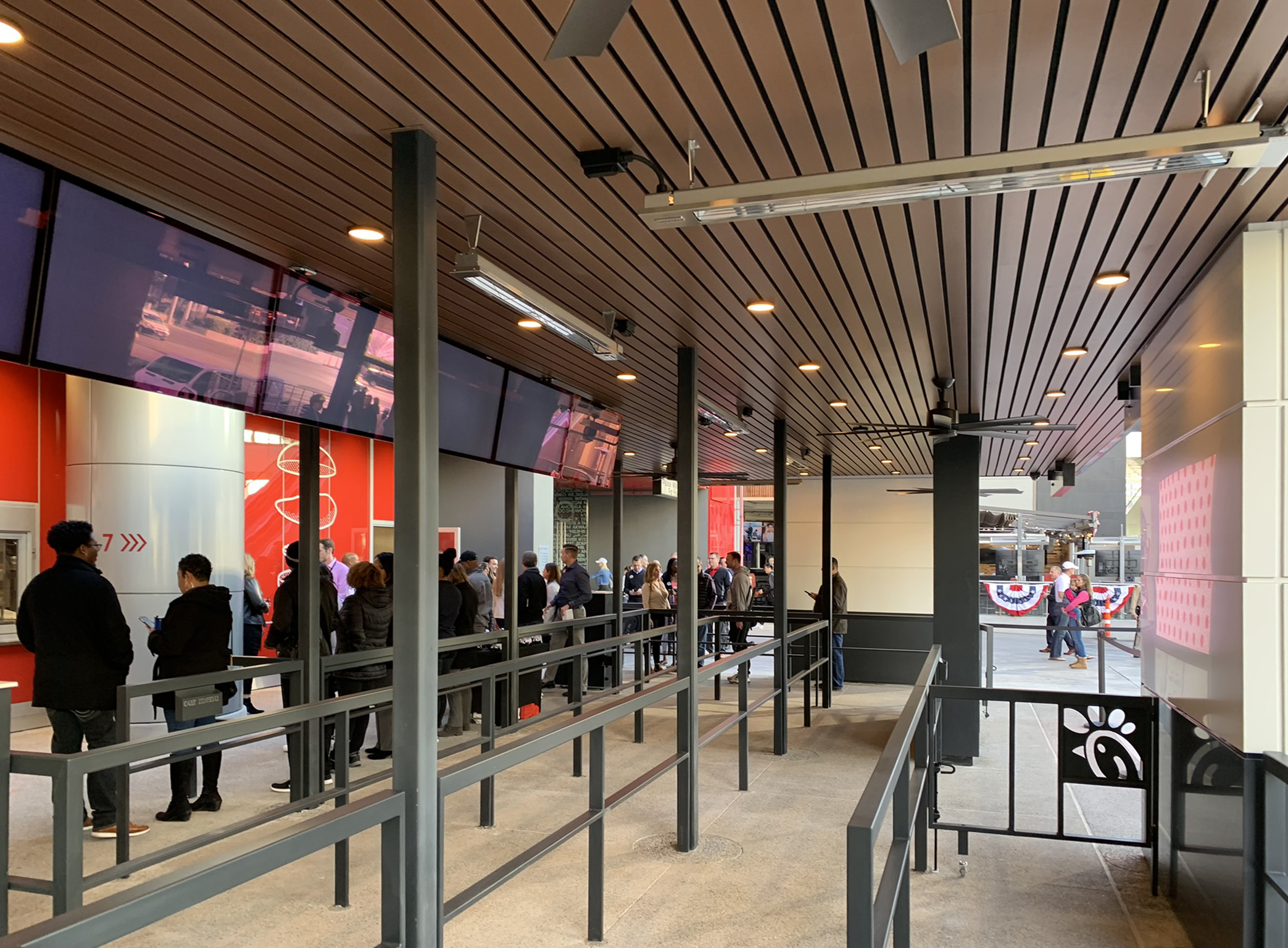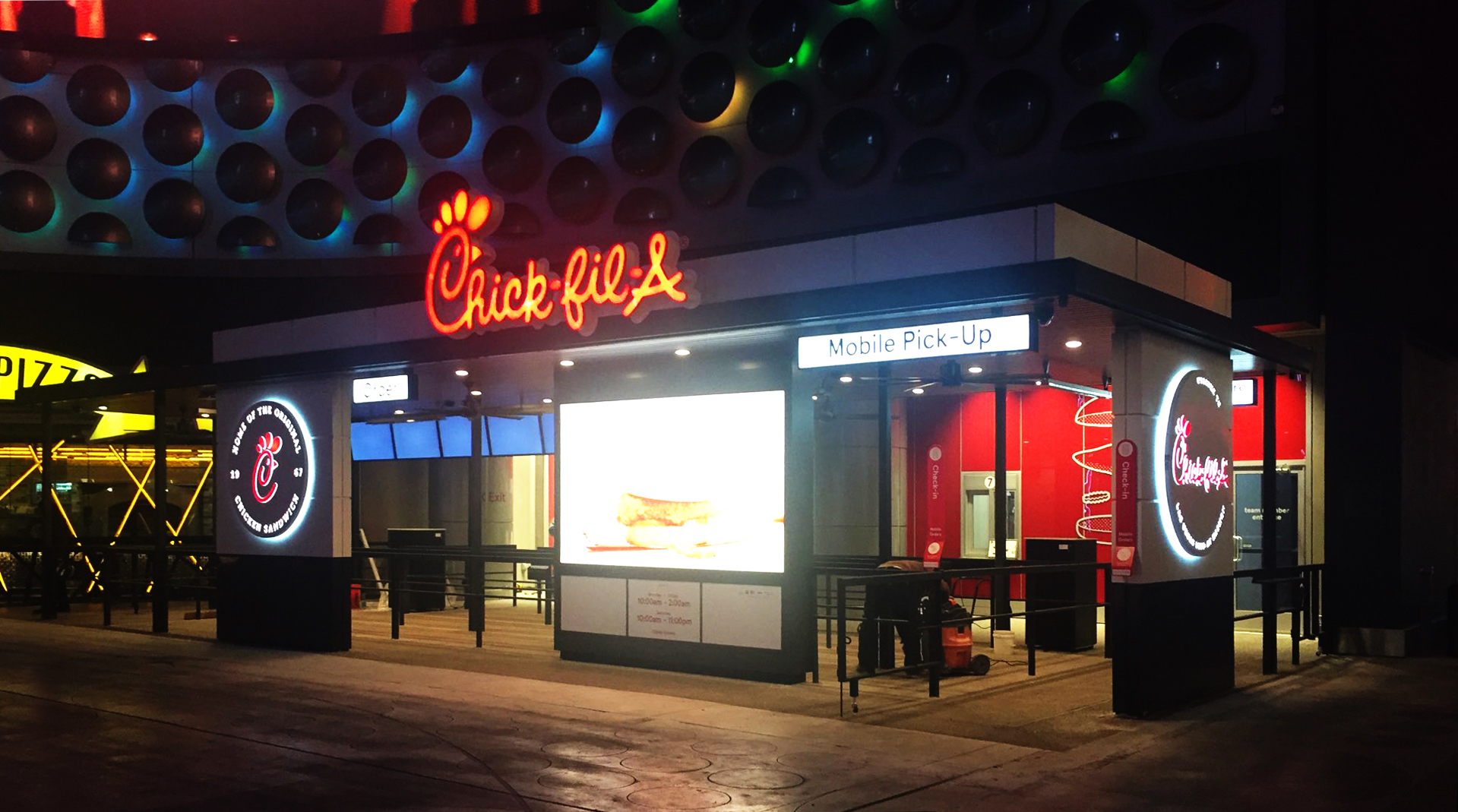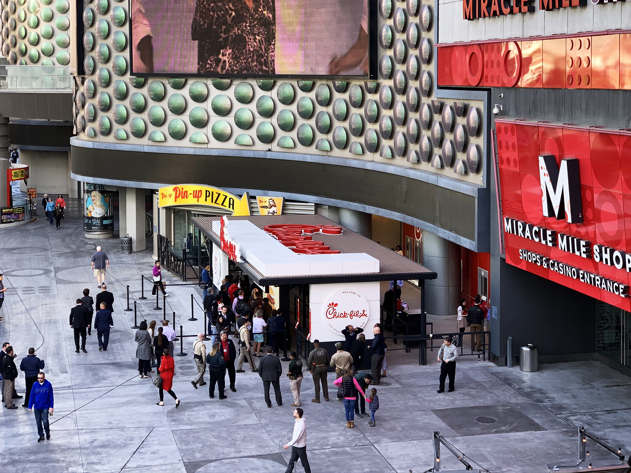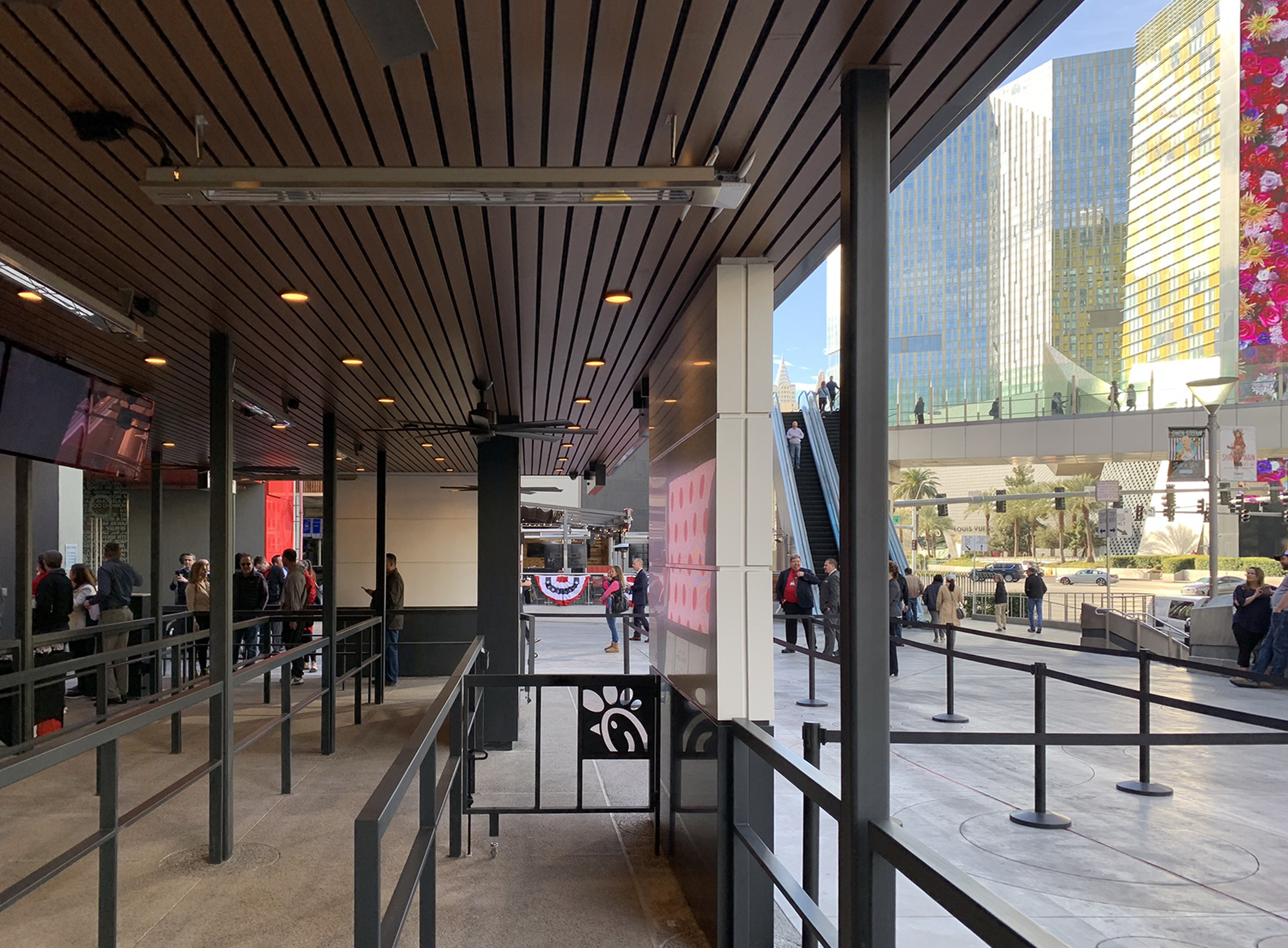 A -To-Go only location at the heart of the busy and fast-paced casino row of Las Vegas Blvd. The ordering and pick-up functions are housed on the ground floor of Planet Hollywood Resort and Casino. A freestanding covered canopy shields the customers waiting in queue line to order while providing effective brand exposure on its roof as viewed from high-rise structures of CityCenter super development across the street. All food prep and cooking are housed on the 5th floor above. Orders are sent to the ground-floor serve area via a multi-channel dumbwaiter system.