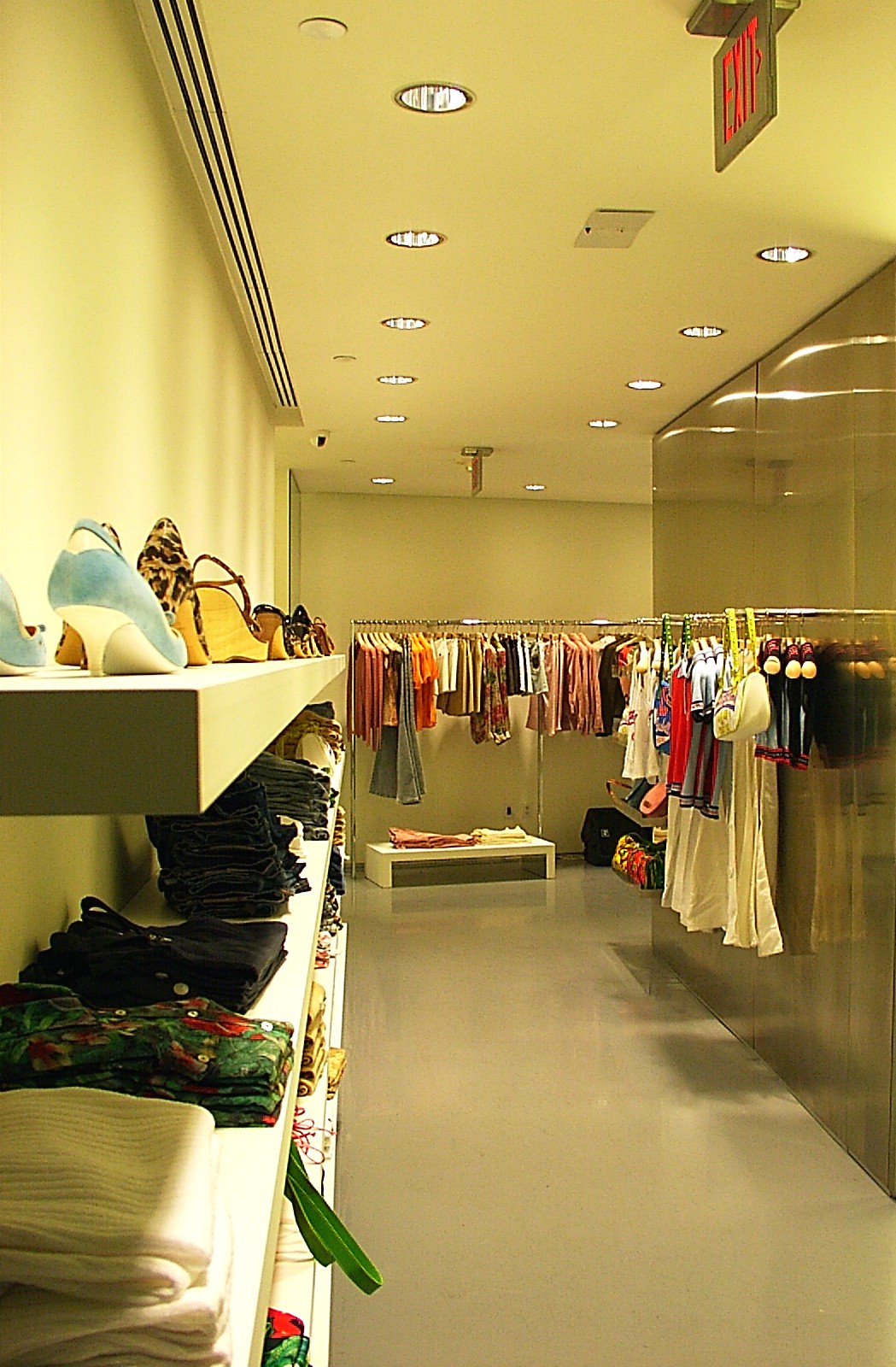 The finish palette is white painted walls and ceiling, gray epoxy resin floor and brushed stainless steel display fixtures and cladding. The scope of the remodel included structural alterations, a new double-story, high-frameless glass storefront and signage, new interior lighting, and upgrades to the electrical and mechanical systems.