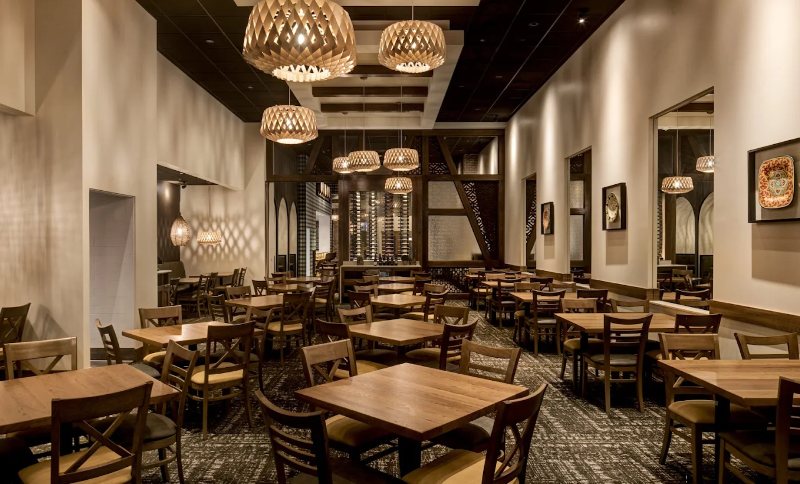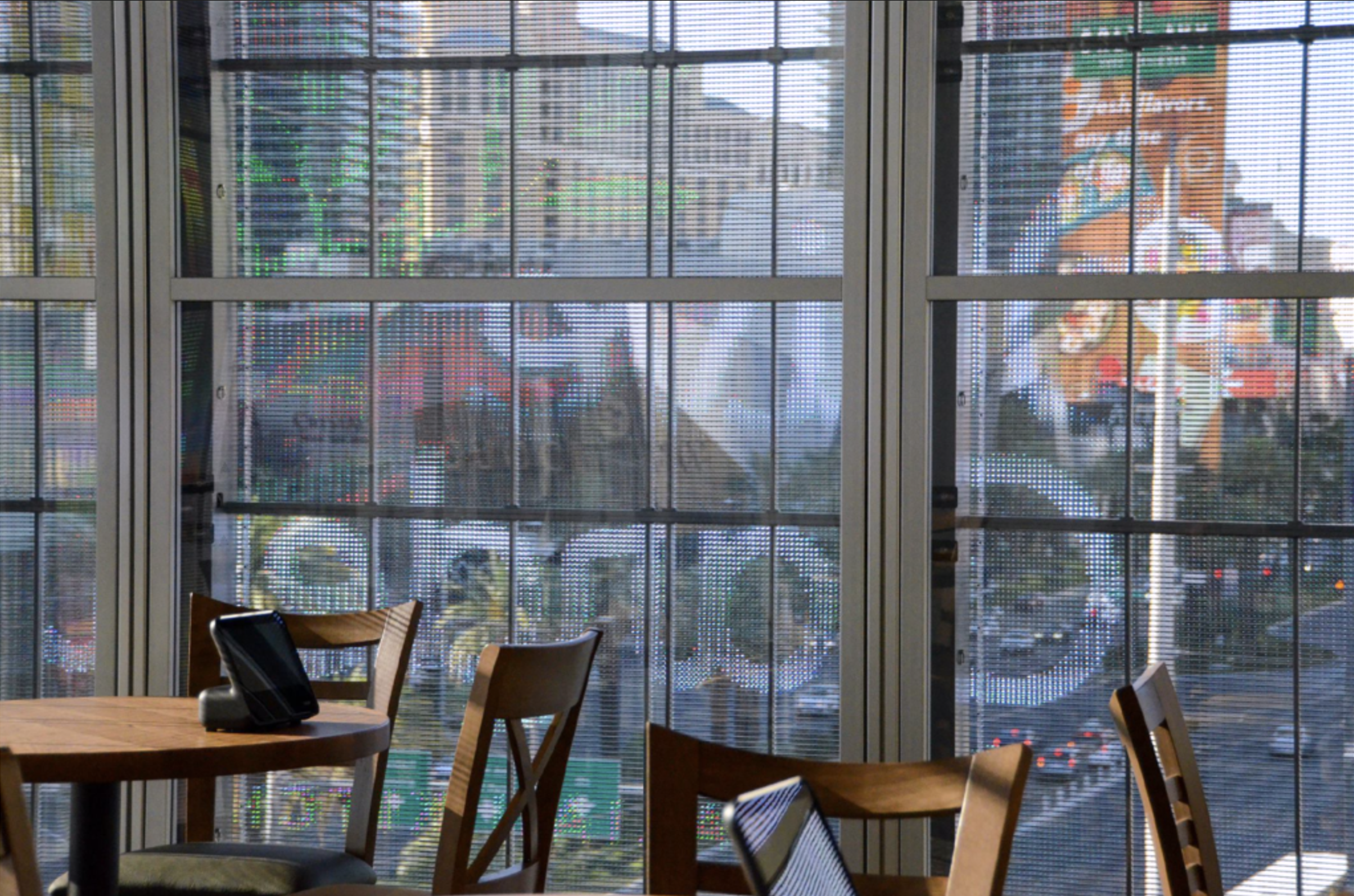 The restaurant is accessed by elevators from the street-level lobby. The 378-seat dining and bar/lounge is divided into several zones, ranging from private/ group dining to a more public, communal layout. The full-height aluminum-and-glass storefront offers sweeping views of the lively Las Vegas Strip below from all diners. A custom frame was crafted to attach to the outside of the building to hold the Transparent LED panels, which put on a dazzling show, demanding attention in the ultra-hyper strip scene at nighttime.