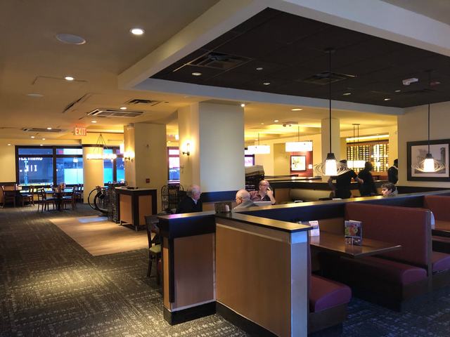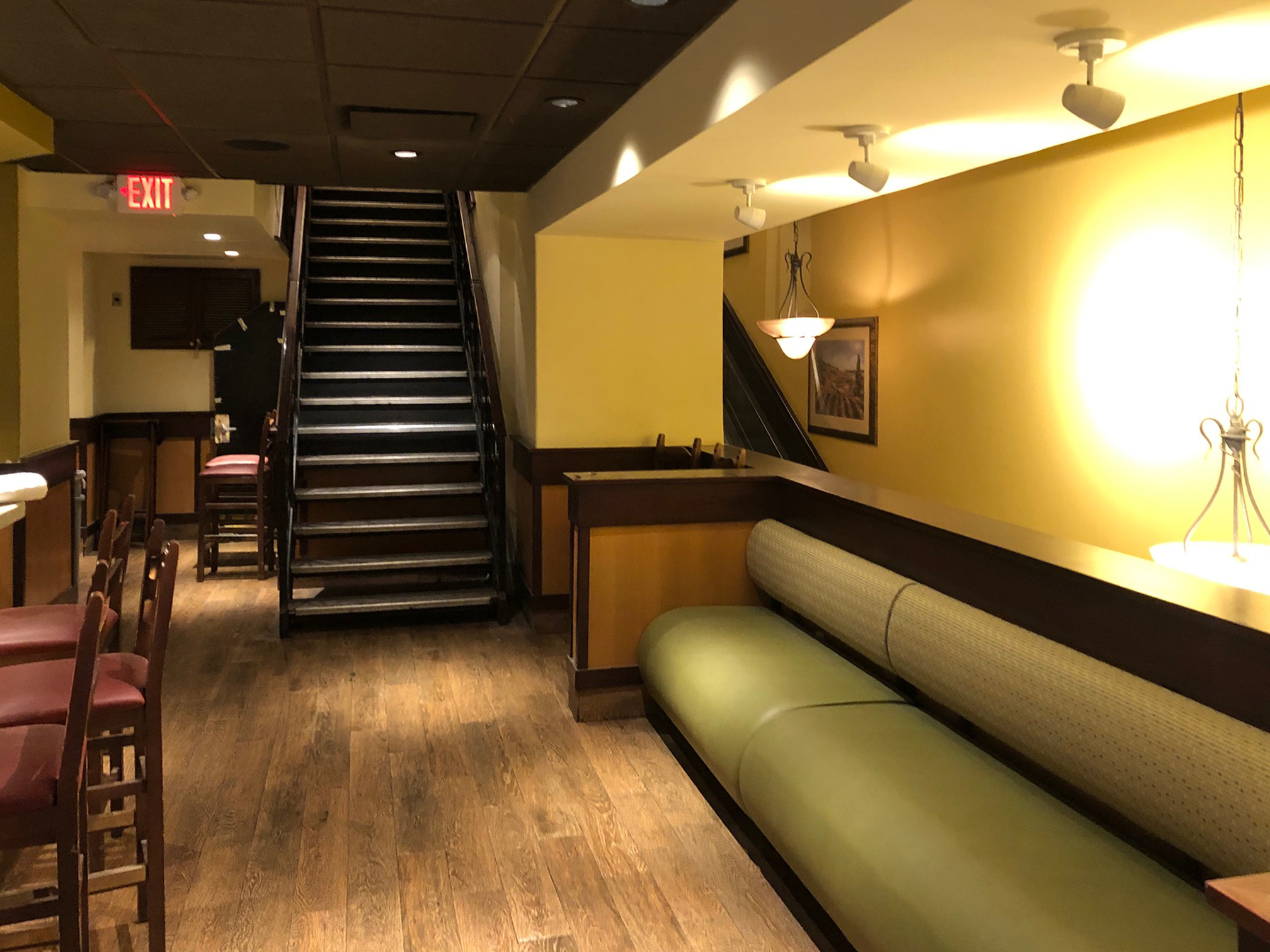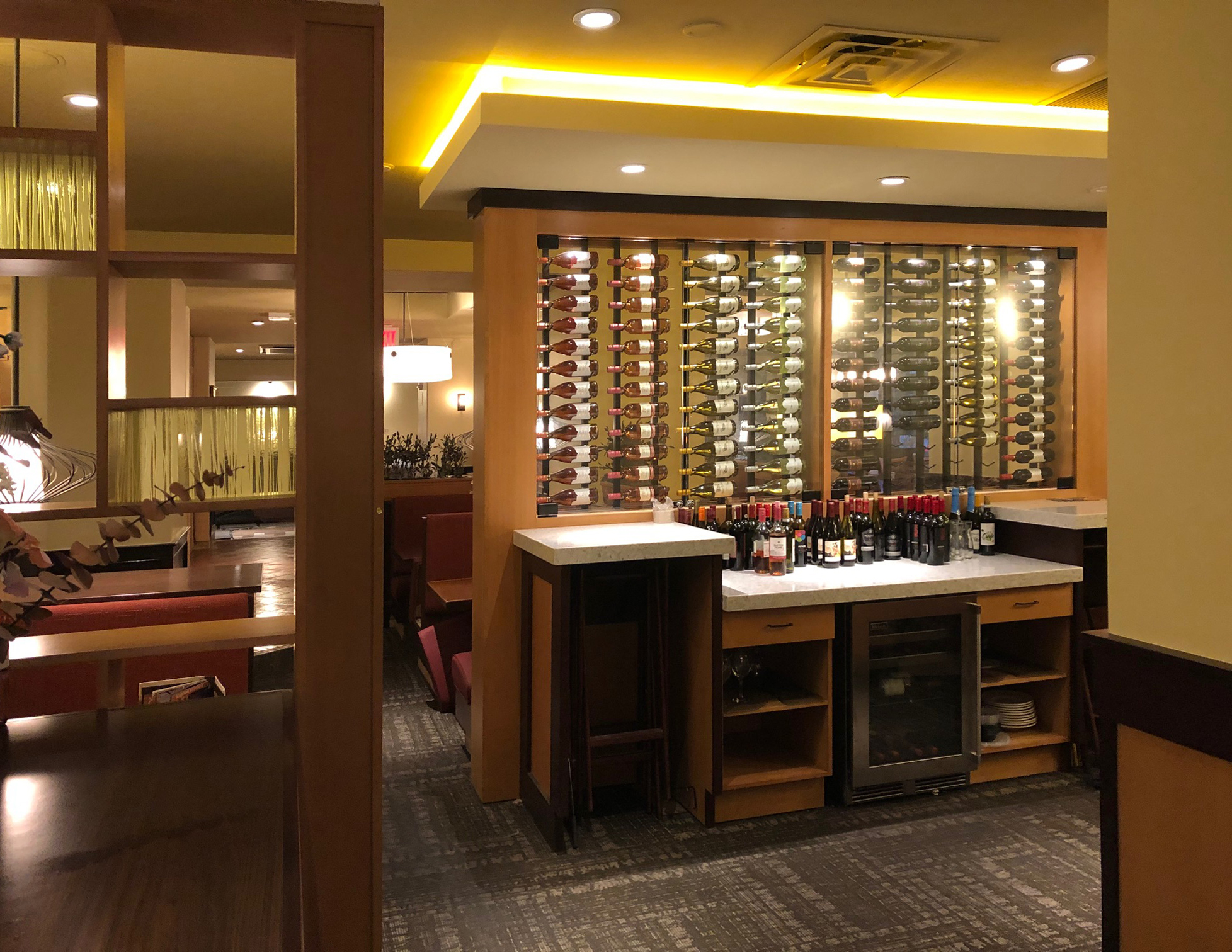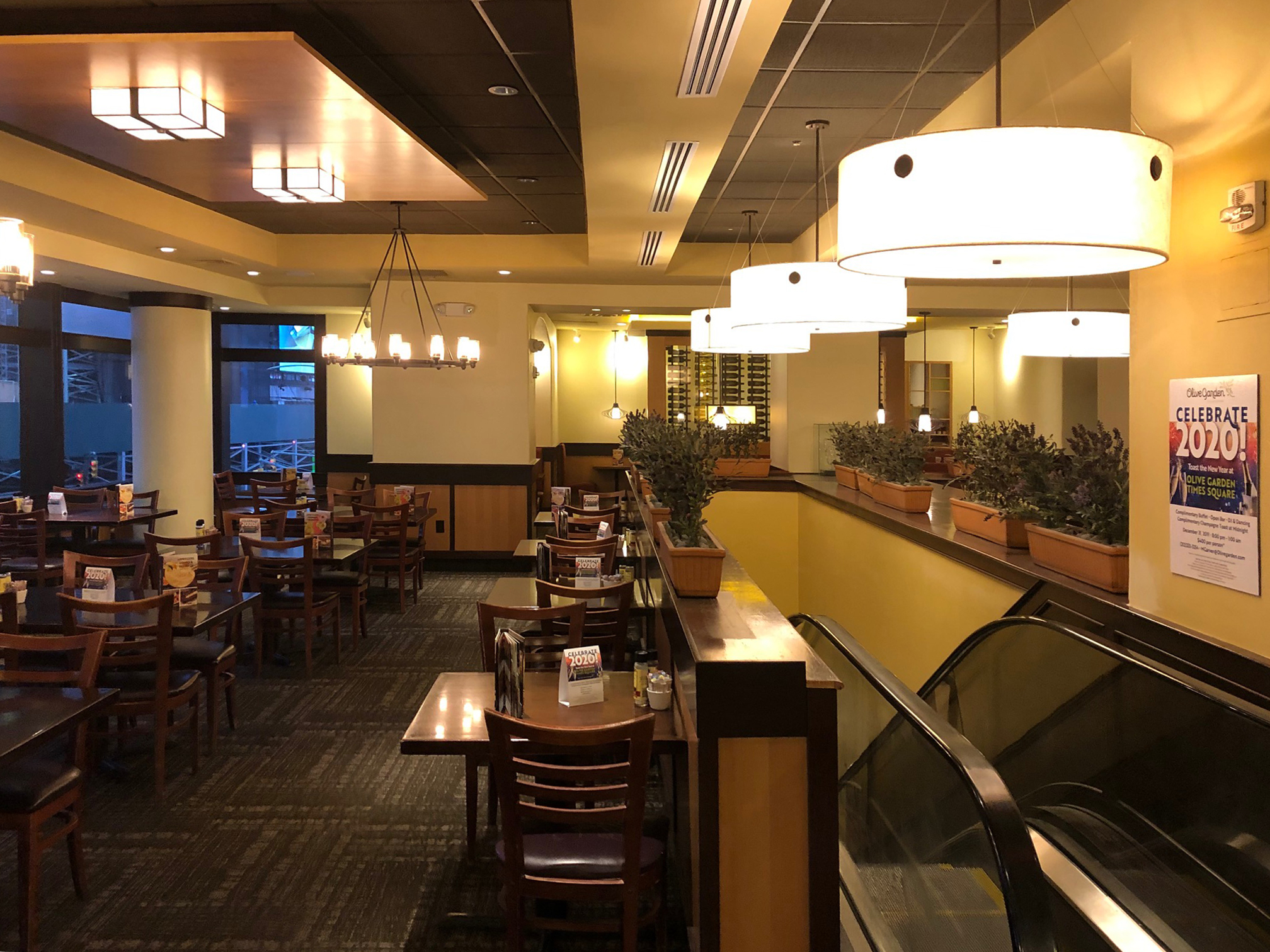 A street-level Lounge/Bar area serves as a welcoming point for customers and features a To-Go pickup area in the back for easy, quick access from the street. A new curved glass-and-steel staircase leads diners to another Bar/Lounge area on the Mezzanine level. The expansive dining level on the second floor is accessed via another retrofitted staircase and an existing escalator. It offers a sweeping view of the world-renowned Times Square from above.